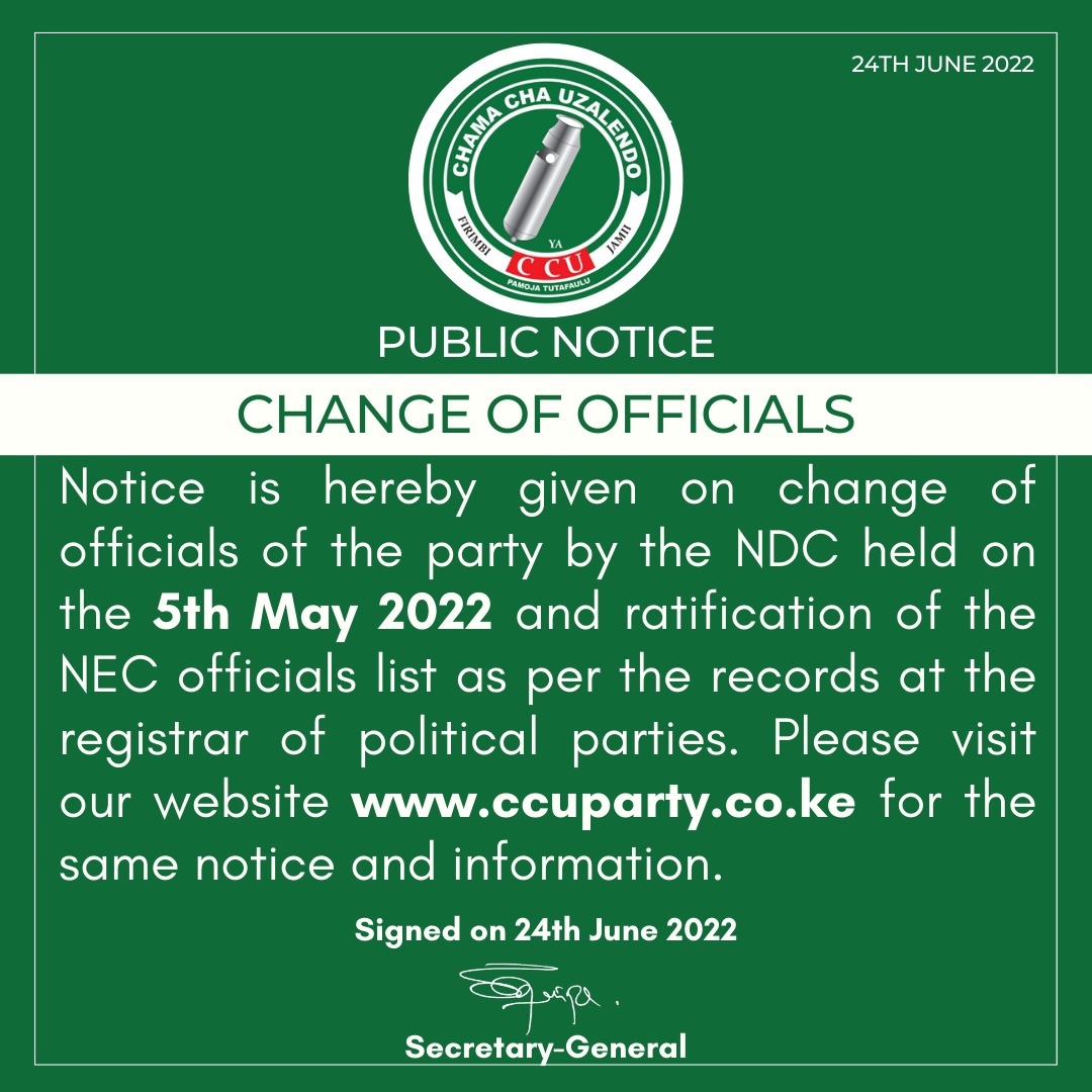 PUBLIC NOTICE: CHANGE OF OFFICIALS
